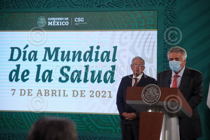 Andrés Manuel López Obrador, presidente de México acompañado de Jorge Alcocer Varela, secretario de Salud; Hugo López-Gatell Ramírez, subsecretario de Prevención y Promoción de la Salud; Olga Sánchez Cordero, secretaria de Gobernación; Zoé Robledo Aburto, director general del IMSS; Luis Cresencio Sandoval González, secretario de La Defensa Nacional y Jenaro Villamil, presidente del Sistema Público de Radiodifusión del Estado Mexicano, durante conferencia matutina dedicada al día de la Salud.