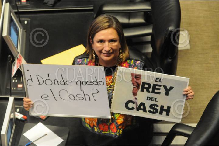 Xochitl Gálvez, senadora panista, muestra dos cartulinas durante la comparecencia de Ariadna Montiel, secretaria del Bienestar.