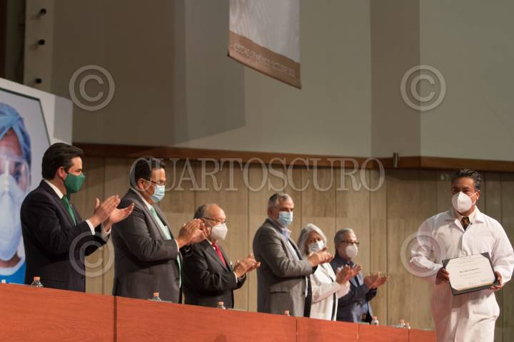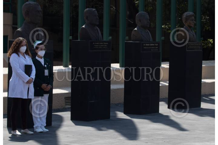Zoe Robledo, director General del IMSS, develó una placa con el nombre del personal médico que atendió la pandemia duranteb la ceremonia del Día Internacional del Médico en el Hospital Centro Médico Siglo XXI