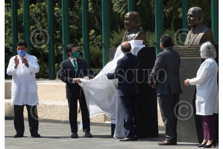 Zoe Robledo, director General del IMSS y Arturo Olivares, secretario general del SNTSS, develaron busto del doctor Rubén Argüero, quien realizó primer trasplante de corazón en México en 1988