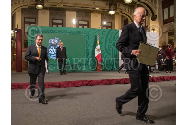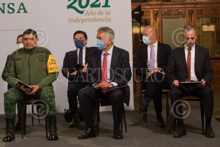 Integrantes del Gabinete en la conferencia mañanera del Presidente de México. Luis Cresencio Sandoval, Jose Ignacio Santos y Hugo Lopez-Gtell.