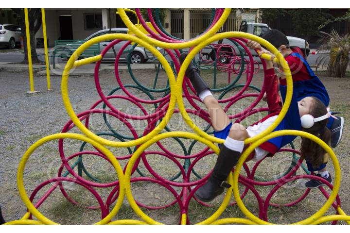 Niños juegan en las instalaciones infantiles de un parque público, en el día de las niñas y los niños.