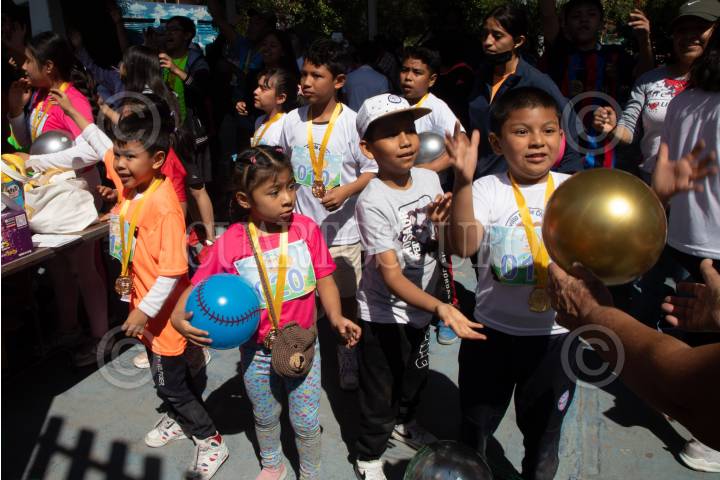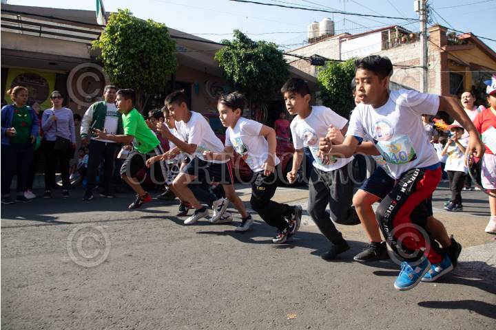 Niños participan en una carrera durante la celebración del Día del Niño y la Niña en el Pueblo de San Sebastian Tecoloxtitlán de la Alcaldía Iztapalapa.