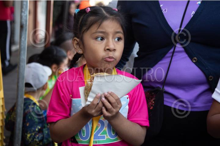 Niña comiendo una gordita durante la celebración del Día del Niño y la Niña en el Pueblo de San Sebastian Tecoloxtitlán de la Alcaldía Iztapalapa.