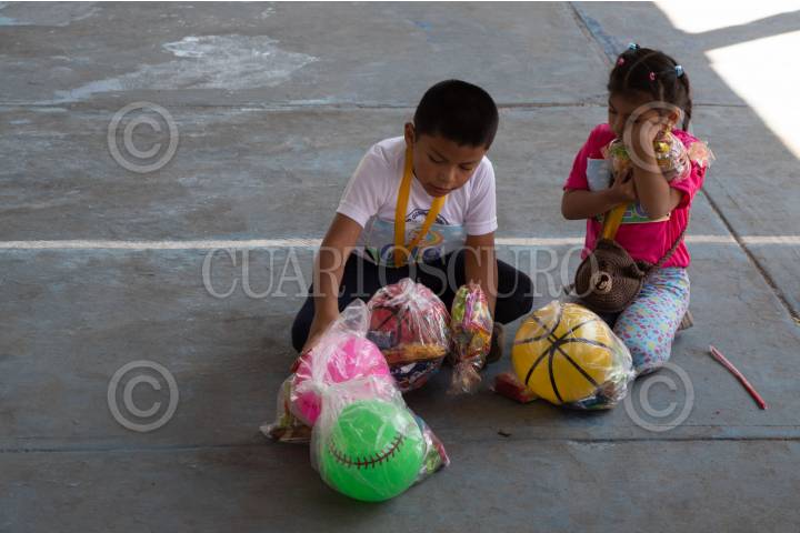 Niños recibiendo regalos durante la celebración del Día del Niño y la Niña en el Pueblo de San Sebastian Tecoloxtitlán de la Alcaldía Iztapalapa.