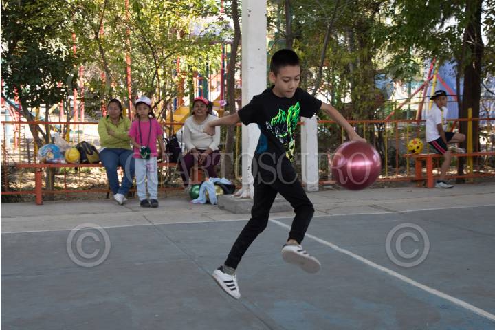 Niño juega con una pelota durante la celebración del Día del Niño y la Niña en el Pueblo de San Sebastian Tecoloxtitlán de la Alcaldía Iztapalapa.
