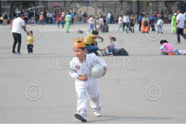 CIUDAD DE MÉXICO, 30ABRIL2024.- Un niño que lleva una corona de cartón, corre por el. Zócalo con una pelota. FOTO: DANIEL AUGUSTO /CUARTOSCURO.COM