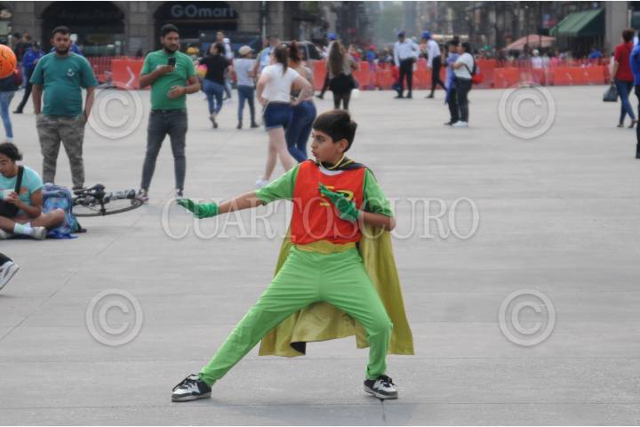 CIUDAD DE MÉXICO, 30ABRIL2024.- Un niño vestido de super héroe camina por el Zócalo. FOTO: DANIEL AUGUSTO /CUARTOSCURO.COM