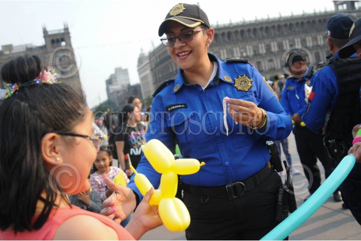 CIUDAD DE MÉXICO, 30ABRIL2024. - Un grupo de policías se encontraba en el Zócalo regalando figuras hechas de globo a los niños. FOTO: DANIEL AUGUSTO /CUARTOSCURO.COM