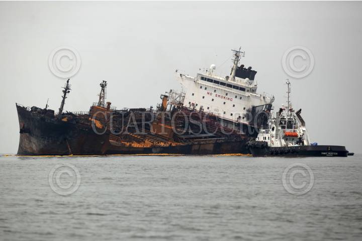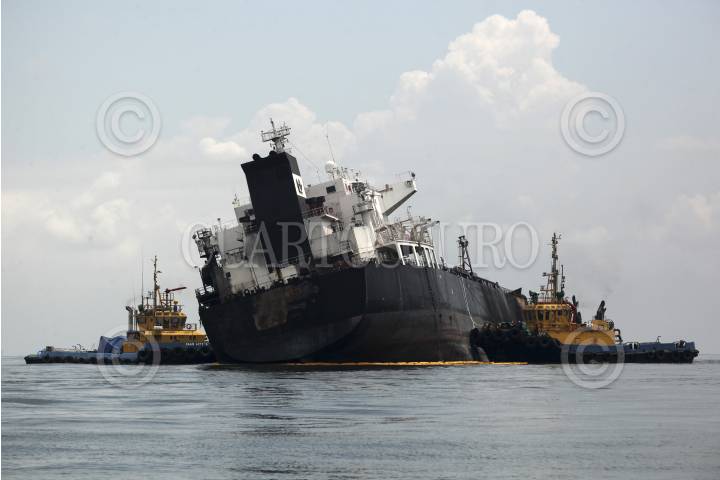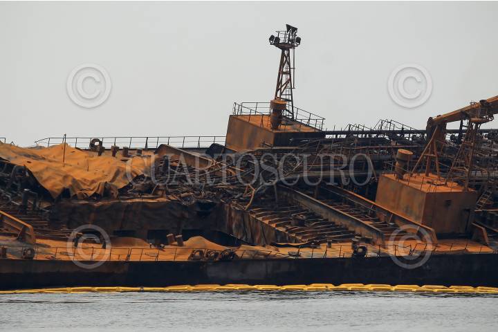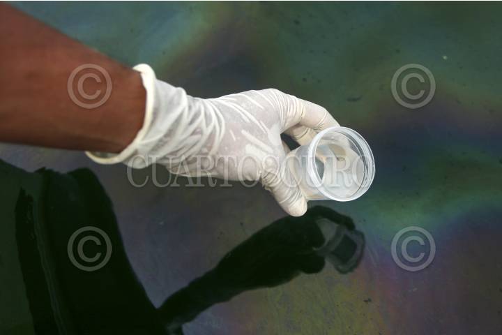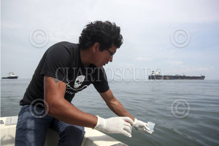 VERACRUZ, VERACRUZ, 26SEPTIEMBRE2016.- Ambientalistas de la organización no gubernamental "Sea Shepherd" navegaron a las inmediaciones del buque "Burgos", siniestrado el pasado sábado, para constatar y tomar muestras biológicas que respalden las denuncias presentadas por pescadores porteños, en las cuales se evidencian grandes manchas de combustible derramadas en el mar. FOTO: FÉLIX MÁRQUEZ /CUARTOSCURO.COM
