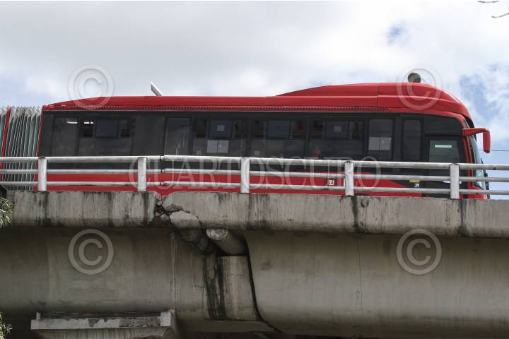 Un carro de metrobús durante su paso por el puente vehicular Muyuguarda.