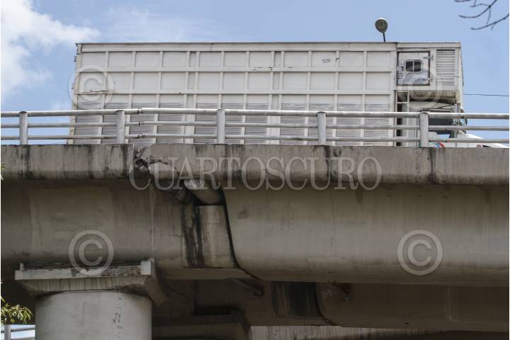 Un camión de carga durante su paso por el puente vehicular Muyuguarda.