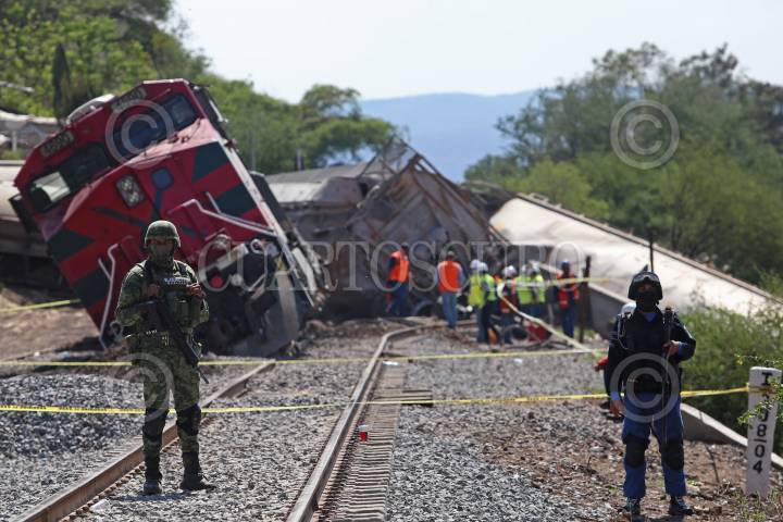 Personal militar y de seguridad de Ferromex vigilan el lugar donde se descarrilo un tren de carga en el municipio de San Isidro Mazatepec.