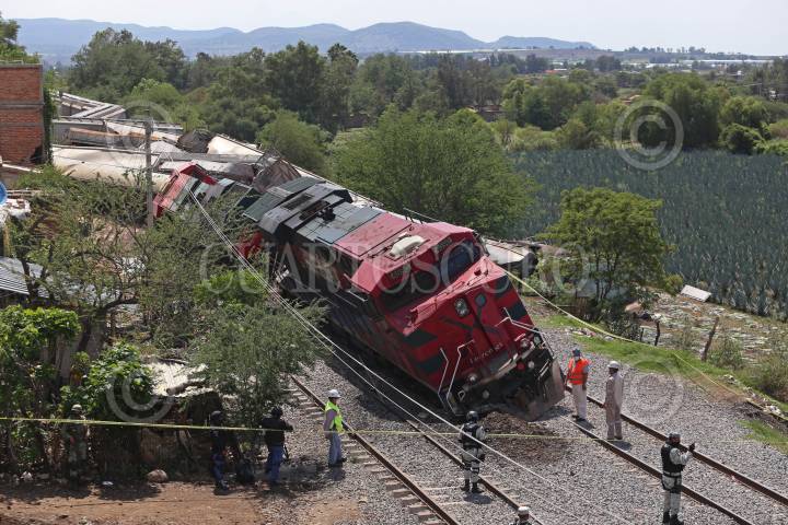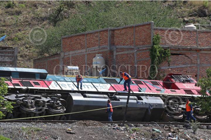 Personal de Ferromex, trabajan en el lugar donde se descarrilo un tren de carga en el municipio de San Isidro Mazatepec.