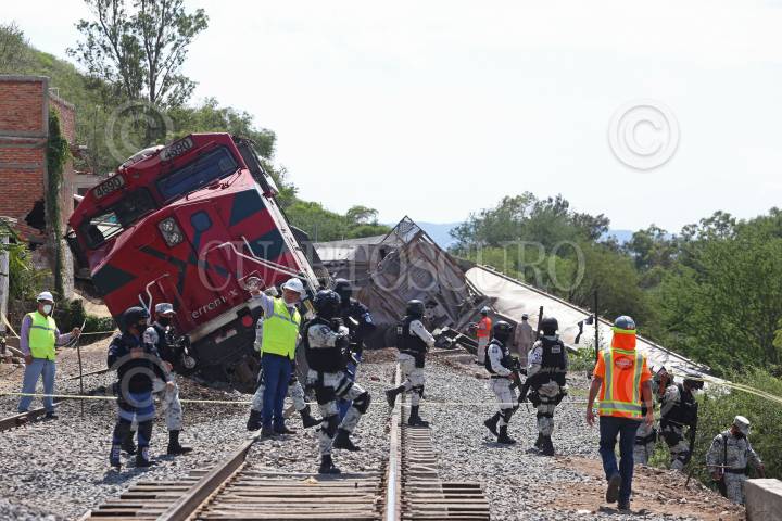 Personal de Ferromex y de la Guardia Nacional, trabajan en el lugar donde se descarrilo un tren de carga en el municipio de San Isidro Mazatepec.
