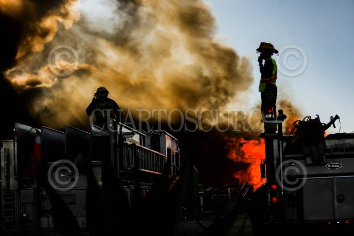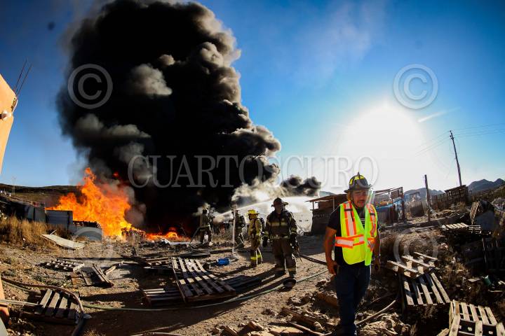 SALTILLO, COAHUILA, 08FEBRERO2025.- La tarde de este sábado se reportó un fuerte incendio de una recicladora de plásticos y madera, en el kilómetro 14 de la carretera Saltillo-Torreón, la fumarola se podía apreciar de cualquier punto de la ciudad capital. Elementos del cuerpo de bomberos realizaron maniobras para controlar el incendio, que sólo quedó en daños materiales. FOTO: ALEJANDRO RODRÍGUEZ/CUARTOSCURO.COM