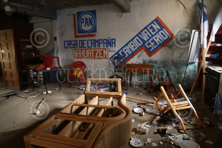 NAHUATZEN, MICHOACÁN. 30JUNIO208.- En víspera de la contienda electoral, la tensión en esta comunidad enclavada en el corazón de la Meseta Purépecha, se ha recrudecido; fueron saqueadas las oficinas del INE y de los comités municipales del PAN, PRI y PRD, y quemaron muebles y material electoral; hubo disparos de arma de fuego, y en los forcejeos, un comunero resultó con un dedo cercenado. Finalmente, el Instituto Nacional Electoral (INE) determinó la no instalación de casillas en la cabecera municipal de Nahuatzen, por lo que se cancelan las elecciones en el lugar luego de los hechos de violencia suscitados el viernes. FOTO: JUAN JOSÉ ESTRADA SERAFIN /CUARTOSCURO.COM