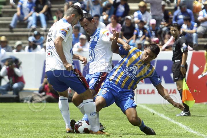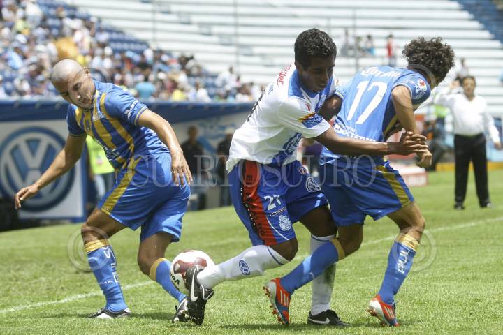 PUEBLA, PUEBLA, 26AGOSTO2012.- Efraín Dimayuga disputa el balón entre dos contrincantes durante el partido correspondiente a la jornada 6 de la liga MX, disputado entre el Puebla de la Franja y el equipo de San Luis en el estadio Cuauhtémoc. FOTO: HILDA RÍOS /CUARTOSCURO.COM