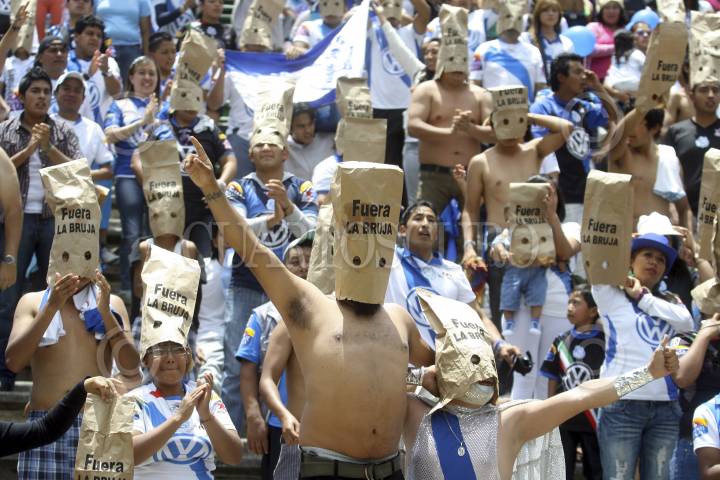 PUEBLA, PUEBLA, 26AGOSTO2012.- Aficionados del Puebla de la Franja portaron bolsas de papel exigiendo la salida vocero del club Hugo Fernández, durante el partido correspondiente a la jornada 6 de la liga MX, disputado entre el Puebla de la Franja y el equipo de San Luis en el estadio Cuauhtémoc. FOTO: HILDA RÍOS /CUARTOSCURO.COM