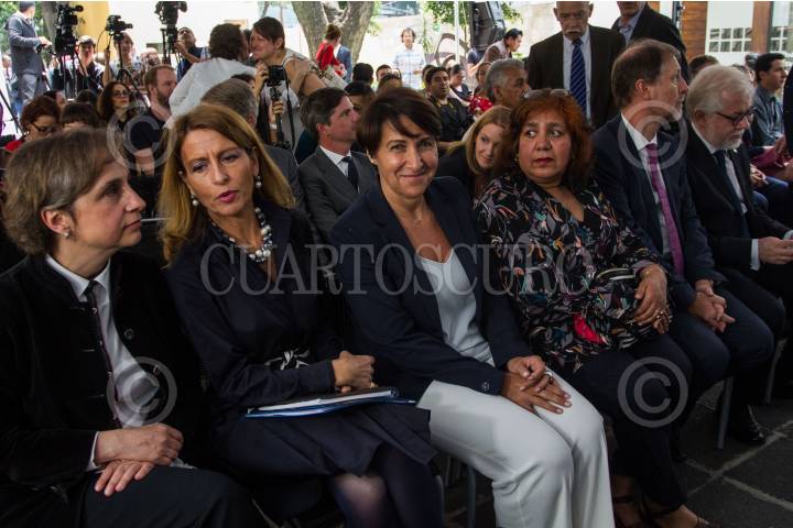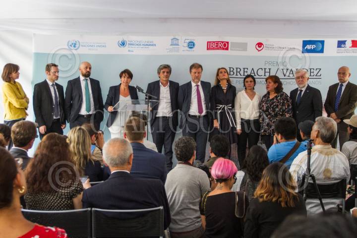 CIUDAD DE MÉXICO, 03MAYO2018.- La periodista Daniela Rea ganó la primera edición del Premio Breach/Valdez de Periodismo y Derechos Humanos, el cual se otorgó en conmemoración del Día Mundial de la Libertad de Prensa. A la entrega asistieron Federico Mastrogiovanni, de la Universidad Iberoamericana, Anne Grillo, Embajadora de Francia en México, Griselda Triana, viuda de Javier Valdez, Jan Jarab, representante en México de la ONU, Nuria Sanz, representante de la Unesco en México, y el periodista Pepe Reveles, entre otros. FOTO: ISAAC ESQUIVEL /CUARTOSCURO.COM