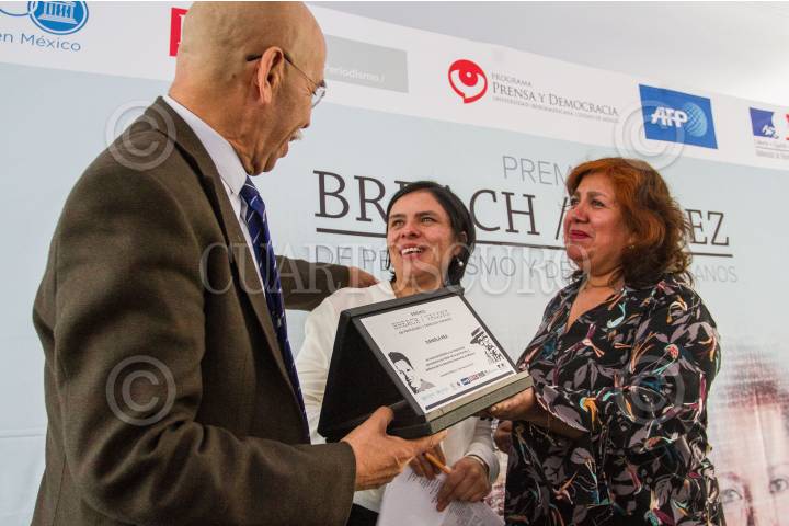 CIUDAD DE MÉXICO, 03MAYO2018.- La periodista Daniela Rea ganó la primera edición del Premio Breach/Valdez de Periodismo y Derechos Humanos, el cual se otorgó en conmemoración del Día Mundial de la Libertad de Prensa. El premio fue entregado por Griselda Triana, viuda de Javier Valdez, y el periodista Pepe Reveles. FOTO: ISAAC ESQUIVEL /CUARTOSCURO.COM