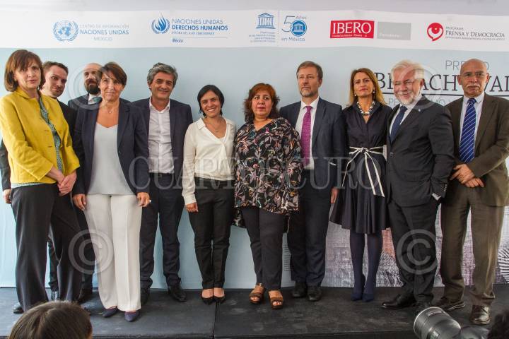 CIUDAD DE MÉXICO, 03MAYO2018.- La periodista Daniela Rea ganó la primera edición del Premio Breach/Valdez de Periodismo y Derechos Humanos, el cual se otorgó en conmemoración del Día Mundial de la Libertad de Prensa. En la imagen, la periodista Carmen Aristegui, Nuria Sanz, representante de la Unesco en México, Anne Grillo, Embajadora de Francia en México, Griselda Triana, viuda de Javier Valdez, y Jan Jarab, representante en México de la ONU. FOTO: ISAAC ESQUIVEL /CUARTOSCURO.COM