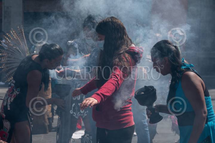 CIUDAD DE MÉXICO, 31DICIEMBRE2024.- Paseantes se hacen limpias con danzantes prehispánicos en el Zócalo para atraer las buenas vibras y empezar bien el año nuevo. FOTO: MOISÉS PABLO/CUARTOSCURO.COM