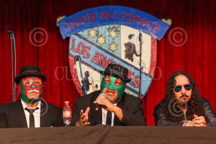 CIUDAD DE MÉXICO, 17JULIO2025.- Integrantes Sr. Bikini estuvieron presentes en la conferencia de prensa para anunciar la gala por los 88 años del Salón Los Ángeles, la cual se celebrará el 09 de Agosto, en la cual aparte del danzón también estarán otras agrupaciones, entre los que se encuentran Triciclo Circus Band, Tropikal Forever, Espanta Suegras & Insulini, entro otros. FOTO: MOISÉS PABLO/CUARTOSCURO.COM