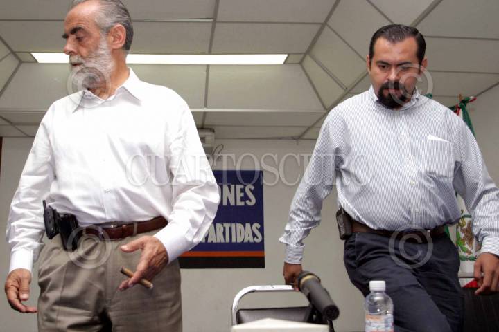 Diego Fernández de Cevallos senador de la República y el dirigente del blanquiazul en Villa Hermosa, Tabasco, Francisco Macossay ofrecieron una rueda de prensa, donde el Jefe Diego comento sobre el caso Sandoval Iñiguez, que no tiene nada de criticable el que un ministro de culto se reúna con el presidente de la República y que el procurador Macedo de la Concha está llevando a cabo una investigación de manera autónoma; aunque refirió, en tono de broma, haberse sentido mal que el cardenal Sandoval no haya querido reunirse con el mismo, por haber ¨seguido al camino del mal¨. FOTO: Gilberto Villasana/CUARTOSCURO.COM