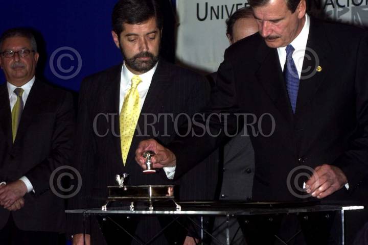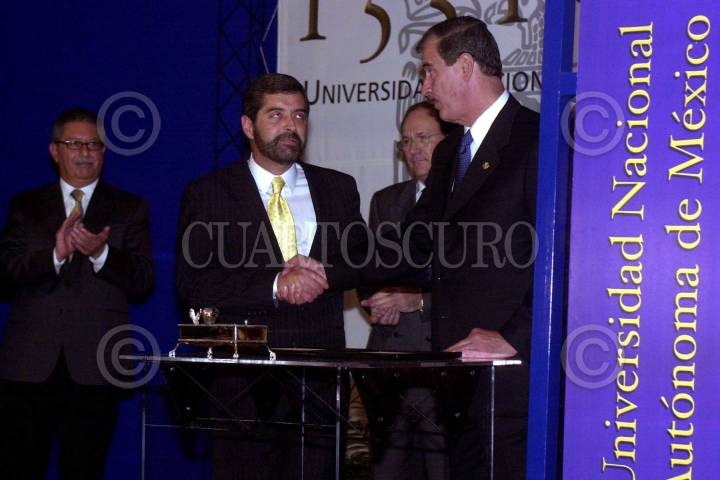 El presidente Vicente Fox en el marco del 450 aniversario de la UNAM es acompañado por el Rector Juan Ramón de la Fuente al momento de dar inicio a la estampilla postal conmemorativa al aniversario de la máxima casa de estudios. FOTO: David Bolaños/CUARTOSCURO.COM