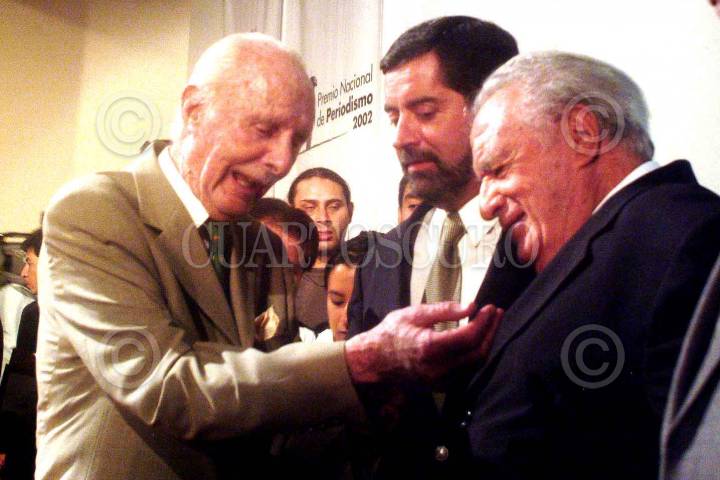 Juan Ramón de la Fuente, rector de la Universidad Autonoma de México, (UNAM) junto con el periodista Julio Scherer al cual se le hizo un reconocimiento durante la entrega del premio Nacional de Periodismo por su trayectoria en medio escrito. FOTO: Eunice Adorno/CUARTOSCURO.COM