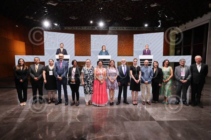 CIUDAD DE MÉXICO, 28ABRIL2024.- Las candidatas y el candidato presidencial; Claudia Sheinbaum, Xóchitl Gálvez, y Jorge Álvarez Máynez, junto con los consejeros electorales previo al segundo debate presidencial que en esta ocasión se llevó a cabo en las instalaciones de los Estudios Churubusco. FOTO: INE/CUARTOSCURO.COM