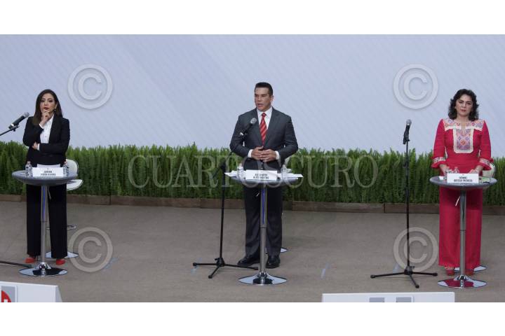 CIUDAD DE MÉXICO, 07AGOSTO2019.- Lorena Piñon, candidata a la presidencia del PRI, Alejando Moreno, candidato a la presidencia del PRI e Ivonne Ortega, candidata a la presidencia del PRI, duramente el segundo debate entre candidatos a la presidencia del comité ejecutivo del Partido Revolucionario Institucional. FOTO: ROGELIO MORALES /CUARTOSCURO.COM