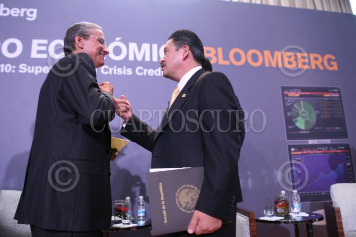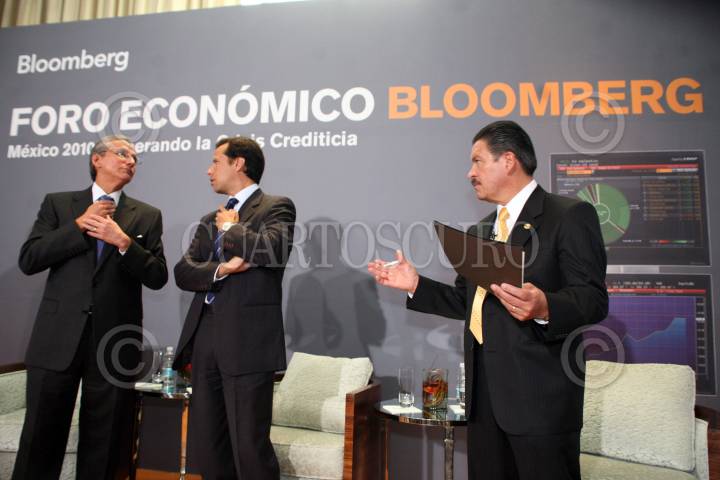 MÉXICO, D.F., 05NOVIEMBRE2009.- Eduardo Solorzano, presidente de Wal-Mart de México, Guillermo Babatz, presidente de la CNBV y Carlos Navarrete Ruiz, Presidente del Senado de la República, durante su participación en el Foro Económico Bloomberg " México 2010: Superando la Crisis Crediticia". FOTO: CUARTOSCURO.COM