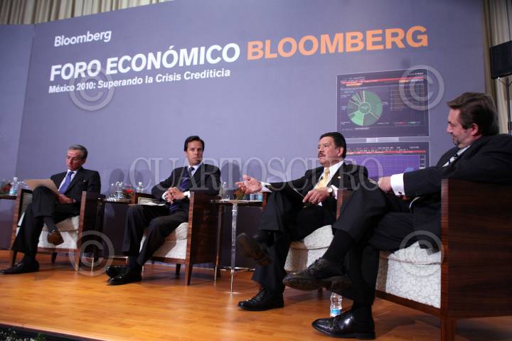 MÉXICO, D.F., 05NOVIEMBRE2009.- Eduardo Solorzano, presidente de Wal-Mart de México, Guillermo Babatz, presidente de la CNBV, Carlos Navarrete Ruiz, Presidente del Senado de la República y Alberto Jones, director general de Moody´s Invertors Service, México, durante su participación en el Foro Económico Bloomberg " México 2010: Superando la Crisis Crediticia". FOTO: CUARTOSCURO.COM