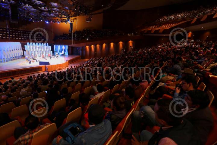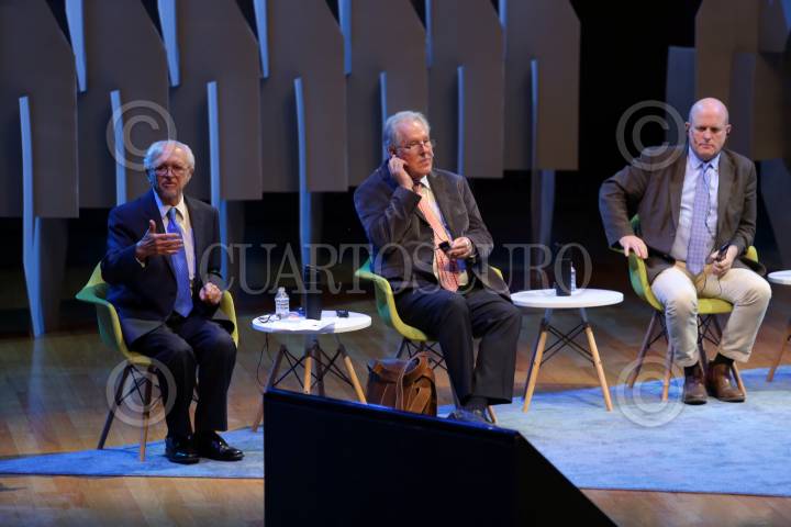 CIUDAD DE MÉXICO, 15NOVIEMBRE2016.- Mario Molina, Lawrence Krauss, Richard Somerville, Daniel P. Schrag, Alicia Bárcena y Noam Chomsky, durante el debate del "Proyecto Originis: cambio climático, consecuencias ambientales y sociales para México y el mundo", realizado en la sala Nezahualcóyotl del Centro Cultural Universitario de la UNAM. FOTO: ADOLFO VLADIMIR /CUARTOSCURO.COM