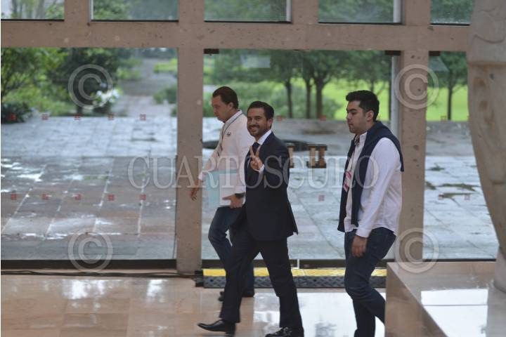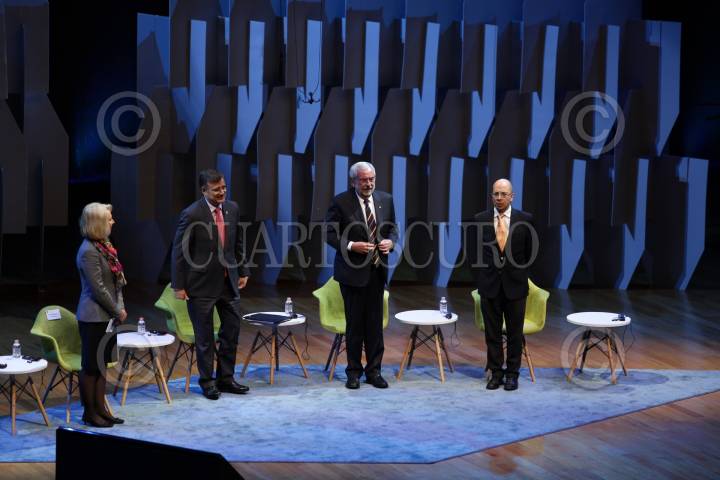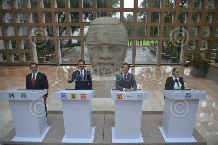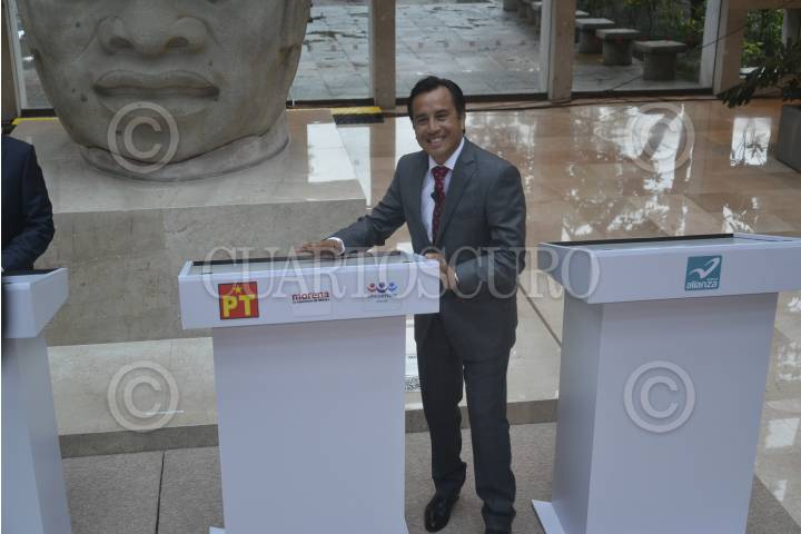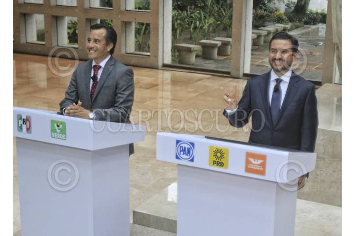 XALAPA, VERACRUZ, 15MAYO2018.- Debate de gobernadores organizado por el Organismo Público Local Electoral, asisten José Yunes Zorrilla candidato del PRI-PVEM, Miguel Angel Yunes Marquez candidato del PAN-PRD-MC, Cuitlahuac García candidato de MORENA-PES y Miran Judith Sheridan candidata del PANAL, durante la presentación, el candidato de MORENA se equivocó y se colocó en el presentador del candidato del PRI. FOTO: ALBERTO ROA /CUARTOSCURO.COM
