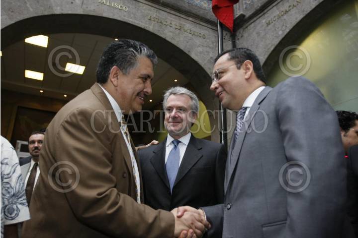 MÉXICO, D.F., 13MAYO2008.- Guadalupe Acosta Naranjo Presidente interino del PRD saluda a German Martínez dirigente Nacional del PAN , mientras Santiago Creel Miranda Presidente de la Mesa directiva del Senado de la República observa durante el debate acerca de los lineamientos que deben incluirse en la Reforma Energética en el Senado de la República. FOTO: IGNACIO GONZALEZ/CUARTOSCURO.COM