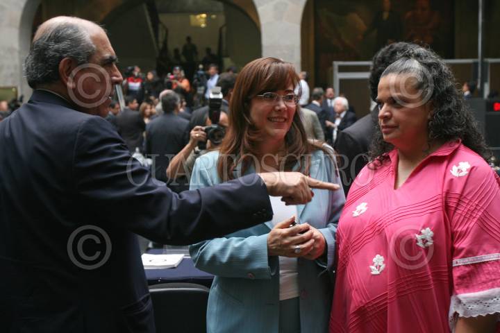 MÉXICO, D.F., 13MAYO2008.- Los senadores Pablo Gómez, Yeidckol Polevnsky coversan con Beatriz Paredes, dirigente nacional del PRI, durante el debate sobre "Los Principios que deben regir la Reforma Energética en México" realizado en el Senado de la República. FOTO: MOISÉS PABLO/CUARTOSCURO.COM