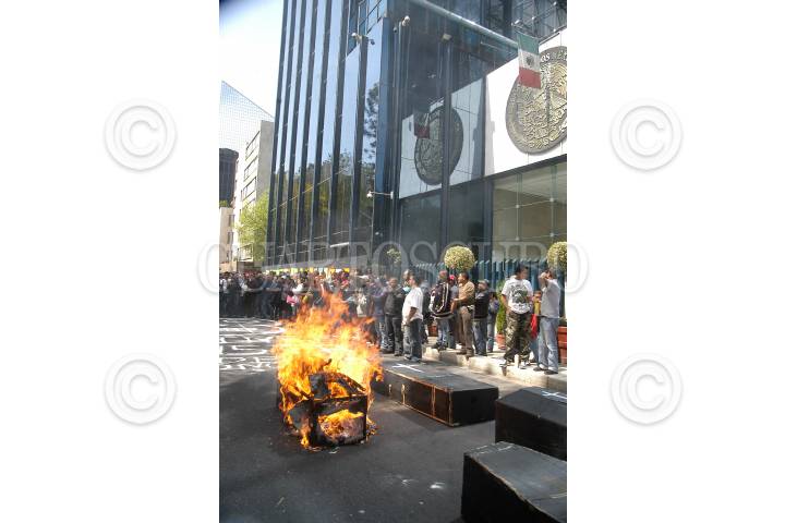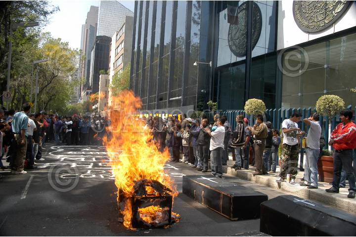 MÉXICO, D.F., 16FEBRERO2010.- Una decena de manifestantes entre ellos mienbros del Barzon, y mineros se manifestaron a las afeuras de la PGR donde realizaron la quema de ataudes FOTO: CUARTOSCURO.COM