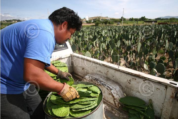 ATLIXCO, PUEBLA. 24AGOSTO2008.- Nopaleros recolectan la cosecha del dáa para vender el producto en la central de abasto de Puebla, la paca con 500 nopales tiene un costo de 50 pesos, es decir que cada 100 nopales tiene un precio aproximado de 10 pesos. FOTO: JAVIER PALACIOS/CUARTOSCURO.COM