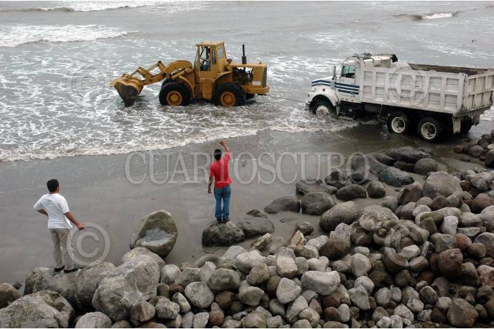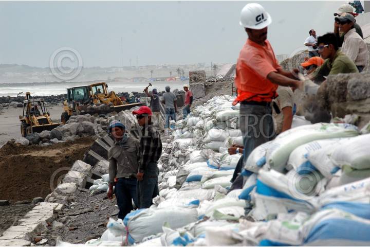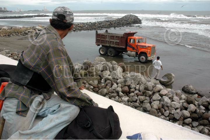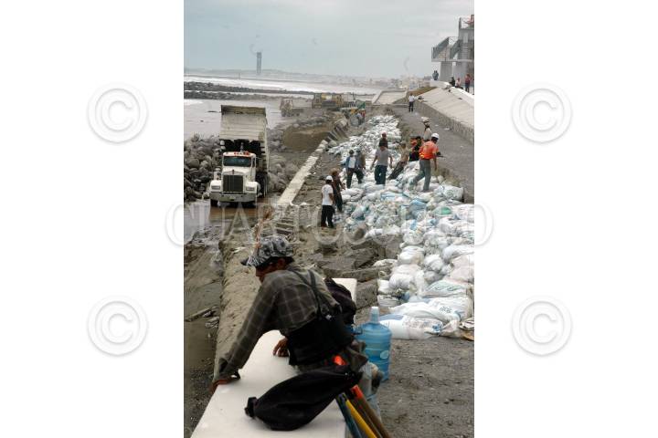 BOCA DEL RIO, VERACRUZ. 06NOVIEMBRE2009.- A tres días de que se desplomara parte del nuevo boulevard "Las Olas", dio inicio la reparación del tablestacado, con la construcción de un rompeolas que a decir de los expertos la inexistencia de este origino la falla. Sera en cuatro meses cuando terminen los trabajos de reparación. FOTO: JOSÉ CANDELARIO/CUARTOSCURO.COM
