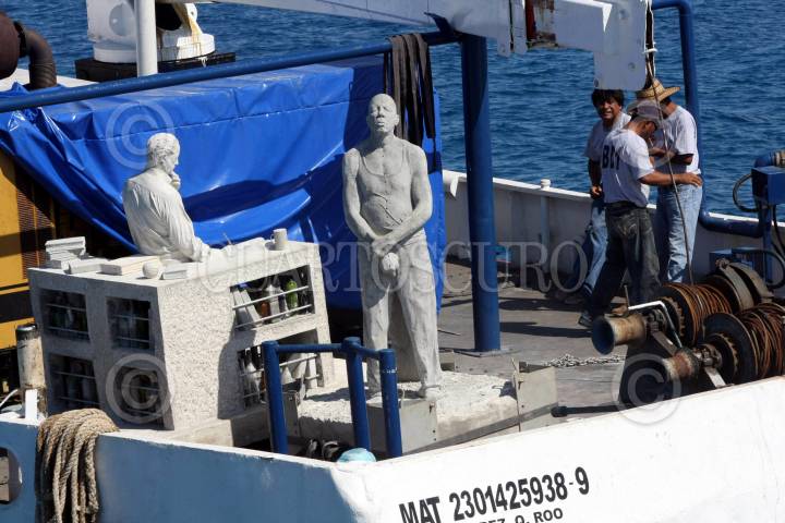 CANCUN, QUINTANA ROO, 21NOVIEMBRE2009.- Hoy se comenzó a sumergir las esculturas de cemento que formarán parte del museo subacuático más grande del mundo, que tendrá en total 400 piezas. Se trata de una interesante apuesta en el caribe mexicano que se ubicará en el Parque Nacional Costa Occidental de Isla Mujeres, Punta Cancún y Punta Nizuc, para que de esa manera parte de los casi 300.000 turistas que visitan la zona al año reduzcan la presión sobre los hábitats naturales. Las esculturas son de un cemento especial que permitirán que rápidamente sean colonizadas por los organismos del mar, es decir que será la naturaleza la que complete las obras escultóricas, y desde luego que será el paraíso de los buceadores. FOTO: AMARANTA PRIETO/CUARTOSCURO.COM