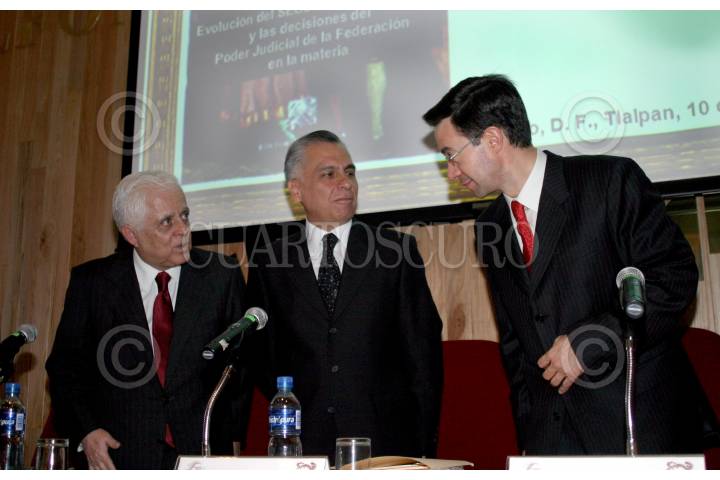 México, D.F., 12ENERO2005.- Angel Domene, banquero, Genaro Gongora Pimentel, ministro de la Suprema Corte de Justicia y Gerardo García Luna, director del AFI, durante la presentación del libro "Evolución del Secuestro en México y las decisiones del Poder Judicial de la Federación en la materia", escrito por el ministro. FOTO: Moisés Pablo/CUARTOSCURO.COM