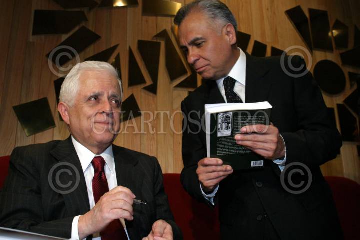 México, D.F., 12ENERO2005.- Genaro Gongora Pimentel, ministro de la Suprema Corte de Justicia y Angel Domene, banquero, durante la presentación del libro "Evolución del Secuestro en México y las decisiones del Poder Judicial de la Federación en la materia", escrito por el ministro. FOTO: Moisés Pablo/CUARTOSCURO.COM
