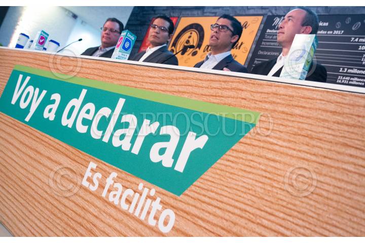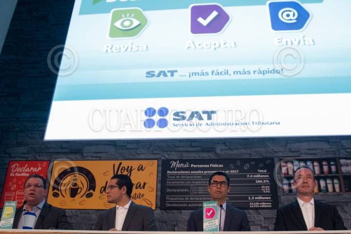 CIUDAD DE MEXICO 03ABRIL2018.- Luis Fernando Cadena, administrador general de tecnología de la información del SAT; Adrián Gaurneros, administrador general de recaudación del SAT; Osvaldo Santín Quiroz, director del Servicio de Administración Tributaria (SAT), y Leopoldo Carrillo, Administrador General de Auditoría Fiscal Federal del SAT, presentaron las mejoras en la plataforma con la que los contribuyentes pueden presentar su declaración anual 2017, ahora el sistema presenta un predeclaración la cual puede ser confirmada o modificada por los usuarios. FOTO: MOISÉS PABLO / CUARTOSCURO.COM