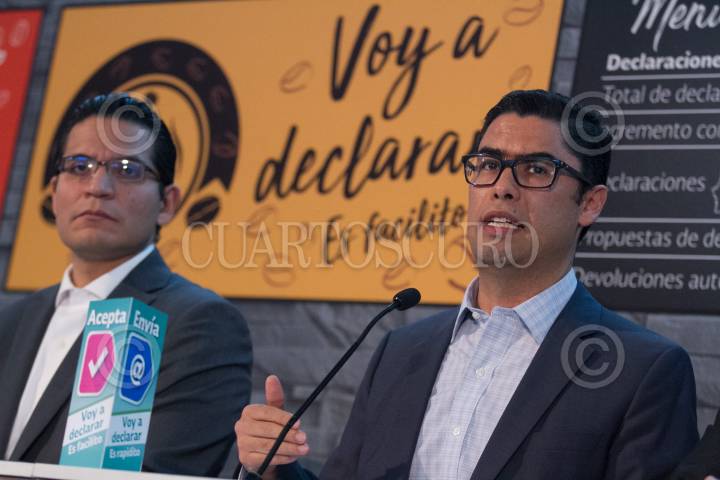 CIUDAD DE MEXICO 03ABRIL2018.- Adrián Gaurneros, administrador general de recaudación del SAT, y Osvaldo Santín Quiroz, director del Servicio de Administración Tributaria (SAT), presentaron las mejoras en la plataforma con la que los contribuyentes pueden presentar su declaración anual 2017, ahora el sistema presenta un predeclaración la cual puede ser confirmada o modificada por los usuarios. FOTO: MOISÉS PABLO / CUARTOSCURO.COM