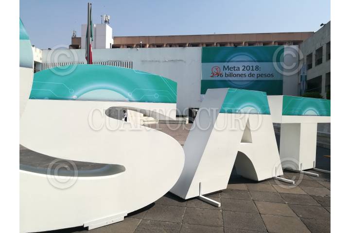 CIUDAD DE MEXICO 03ABRIL2018.- En las oficinas centrales del Servicio de Administración Tributaria (SAT) han colocado mantas para promover la presentación de las declaraciones anuales entre los contribuyentes. FOTO: MOISÉS PABLO / CUARTOSCURO.COM