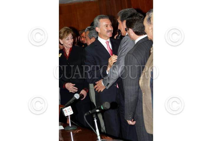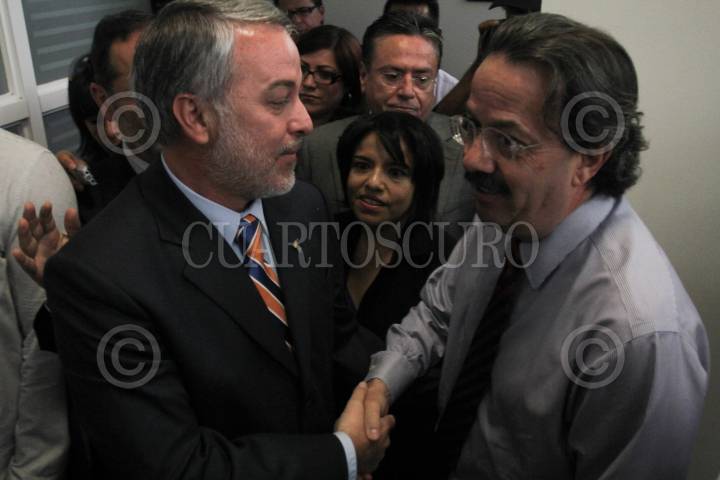 MÉXICO, D.F., 22SEPTIEMBRE2011.- Emilio González Márquez, saluda a Juan Molinar Horcasitas, después de anunciar la declinación de González Márquez a competir por la candidatura del PAN a la Presidencia de la República. FOTO: SAÚL LÓPEZ/CUARTOSCURO.COM