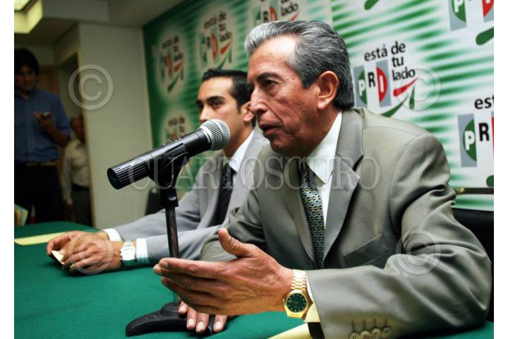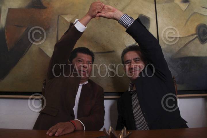 OAXACA, OAXACA, 19JUNIO2012.- Joaquín Ruiz Salazar (izq.) Candidato al Senado por el Partido Verde Ecologista de México (PVEM) declinó esta tarde a favor de Diódoro Carrasco Altamirano (der.) aspirante al Senado por el Partido Acción Nacional (PAN). Ambos ofecieron una conferencia de prensa en la que Ruiz Salasar reconoció no contar con el aval de su partido, sin embargo, aseguró es la mejor elección que pudo hacer en beneficio de Oaxaca. FOTO: ARTURO PÉREZ ALFONSO /CUARTOSCURO.COM